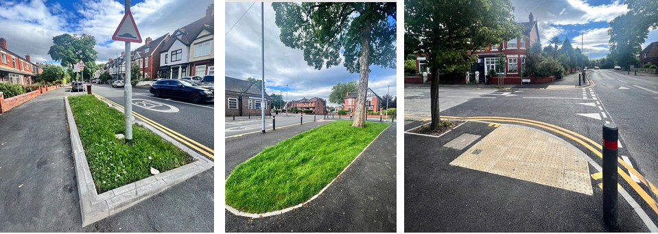 Below shows completed works on Burnage Lane rain garden, Burnage Lane green area, and Alexander Drive / Burnage Lane Junction: